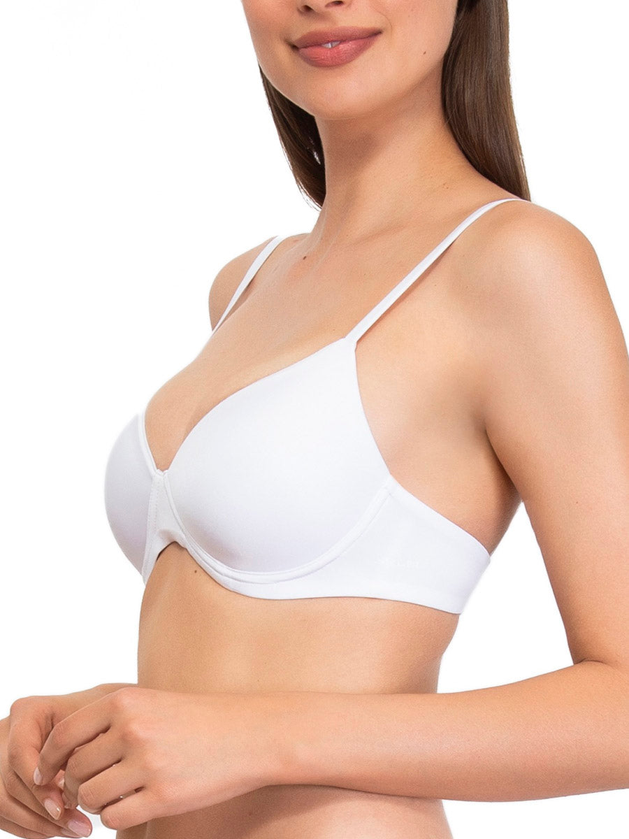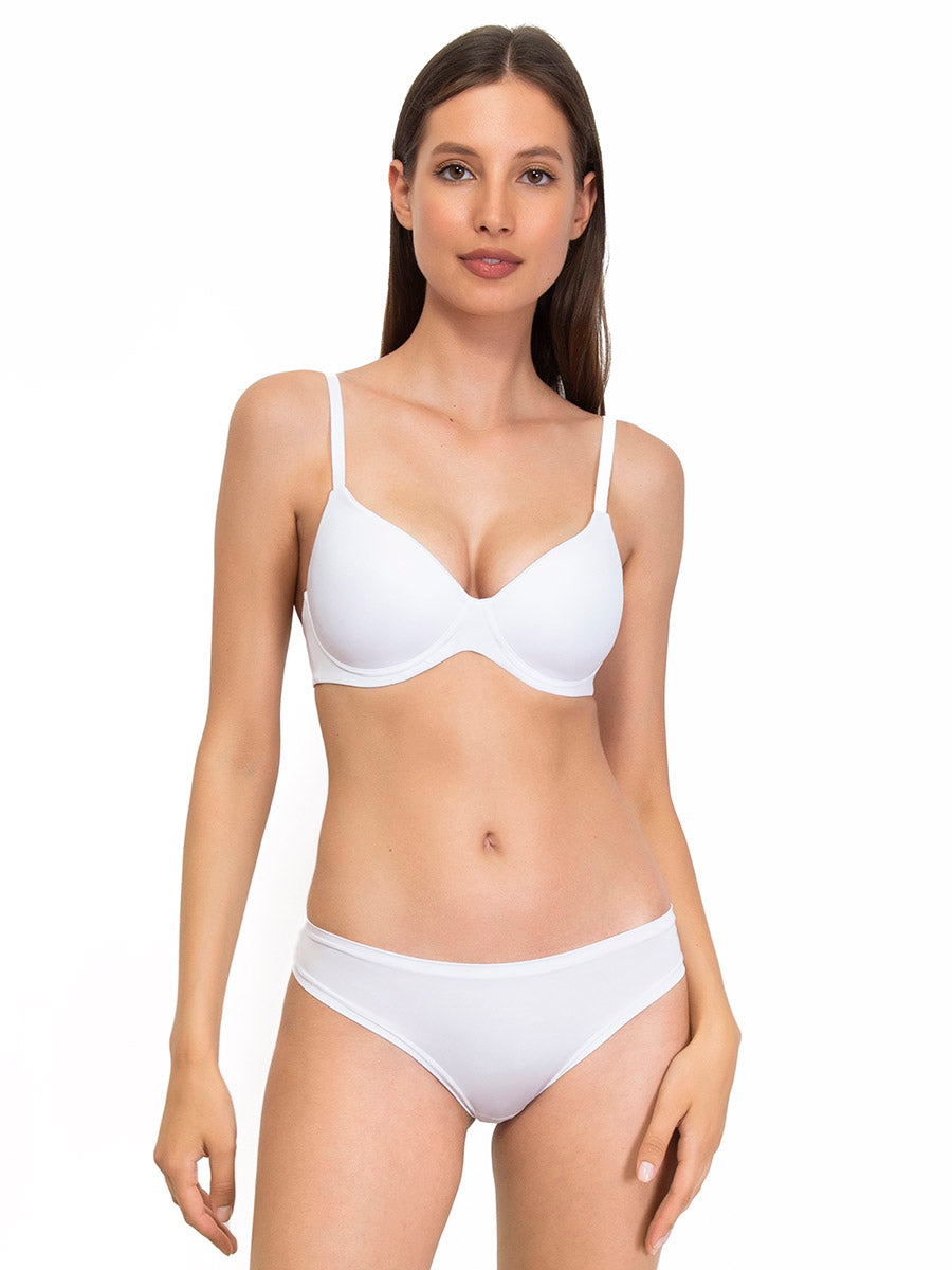 Reggiseno preformato con coppe graduate, senza ferretto, realizzato in morbidissima microfibra semilucida con eleganti profili sulle coppe. Modello con stecche laterali per assicurare ottima vestibilità e spalline ricoperte, per un capo elegante e confortevole.