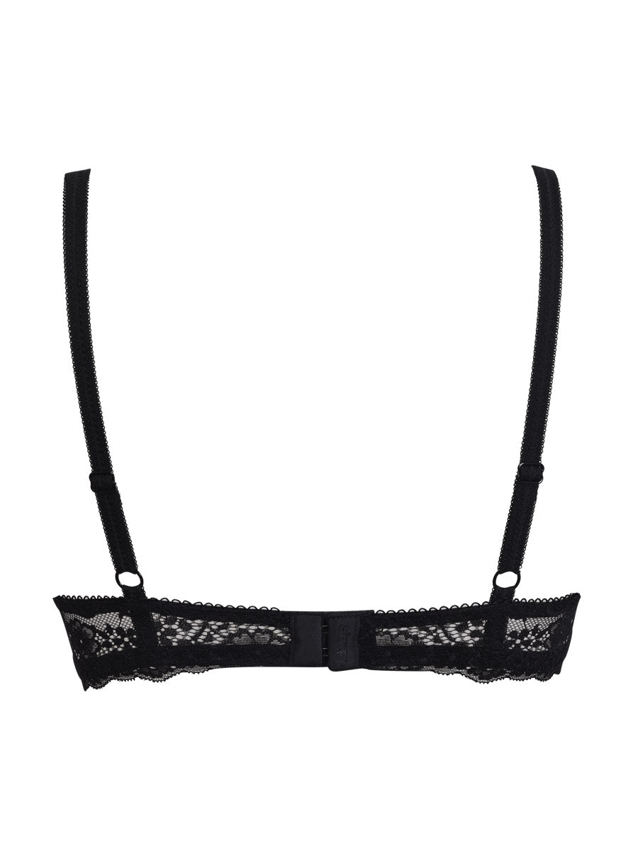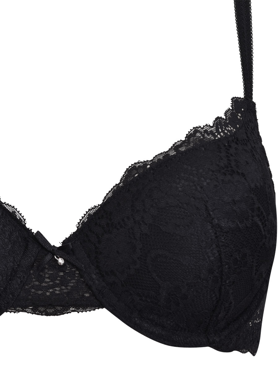 Reggiseno imbottito con ferretto, realizzato in raffinata balza di pizzo con cordonetto in contrasto a motivo floreale. Torace in laize di pizzo stretch e spalline regolabili. Dettaglio a centroseno di fiocchetto di raso con gioiello e punto luce.