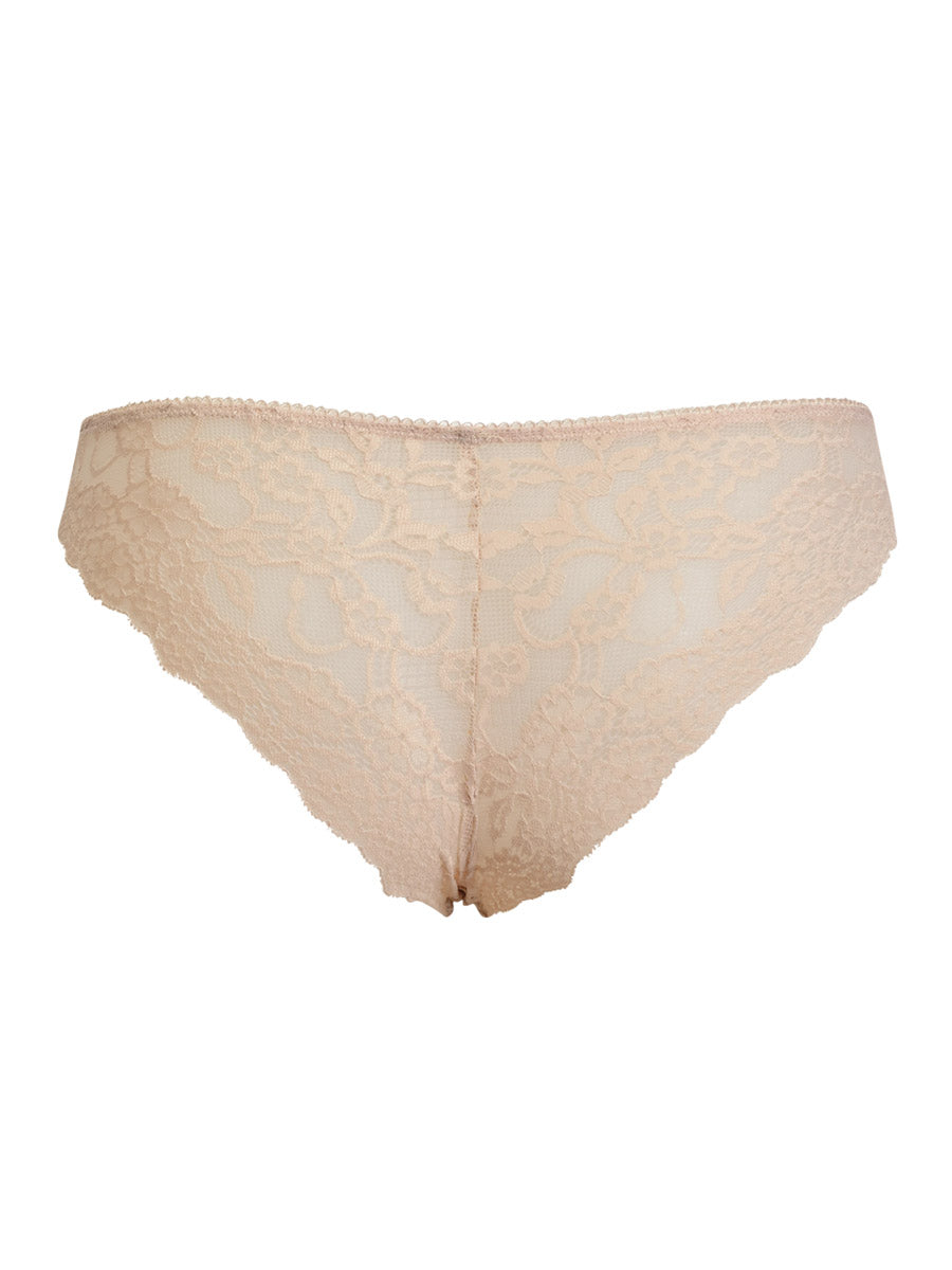 Slip realizzato in raffinata balza di pizzo stretch con cordonetto in rilievo a motivo floreale. Tassello 100% cotone.